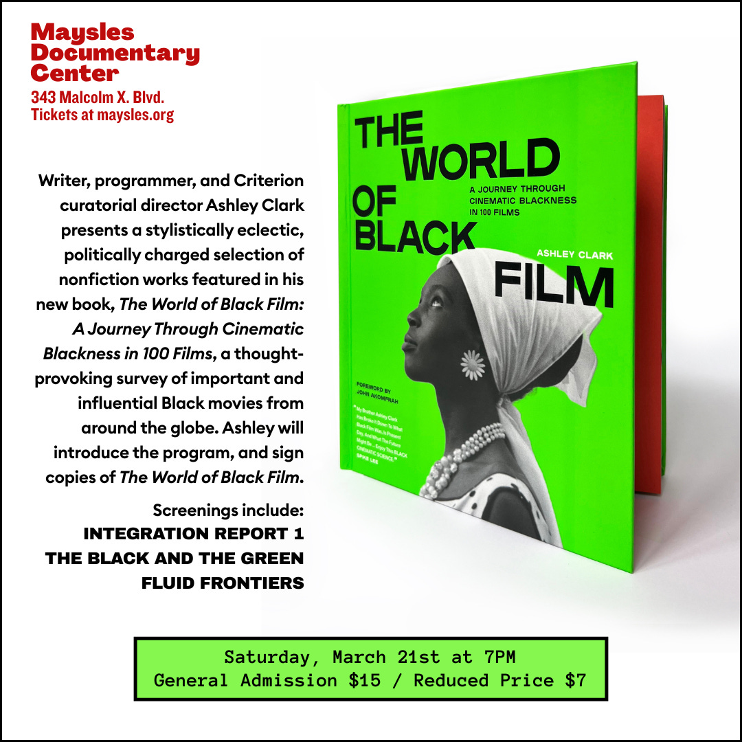 On Saturday March 21 at 7pm at Harlem’s Maysles Documentary Center, I will be presenting three excellent nonfiction films: Ephraim Asili’s Fluid Frontiers, Madeline Anderson’s Integration Report 1, and St. Clair Bourne’s The Black and the Green, followed by a book signing and reception. Tickets and more info here.